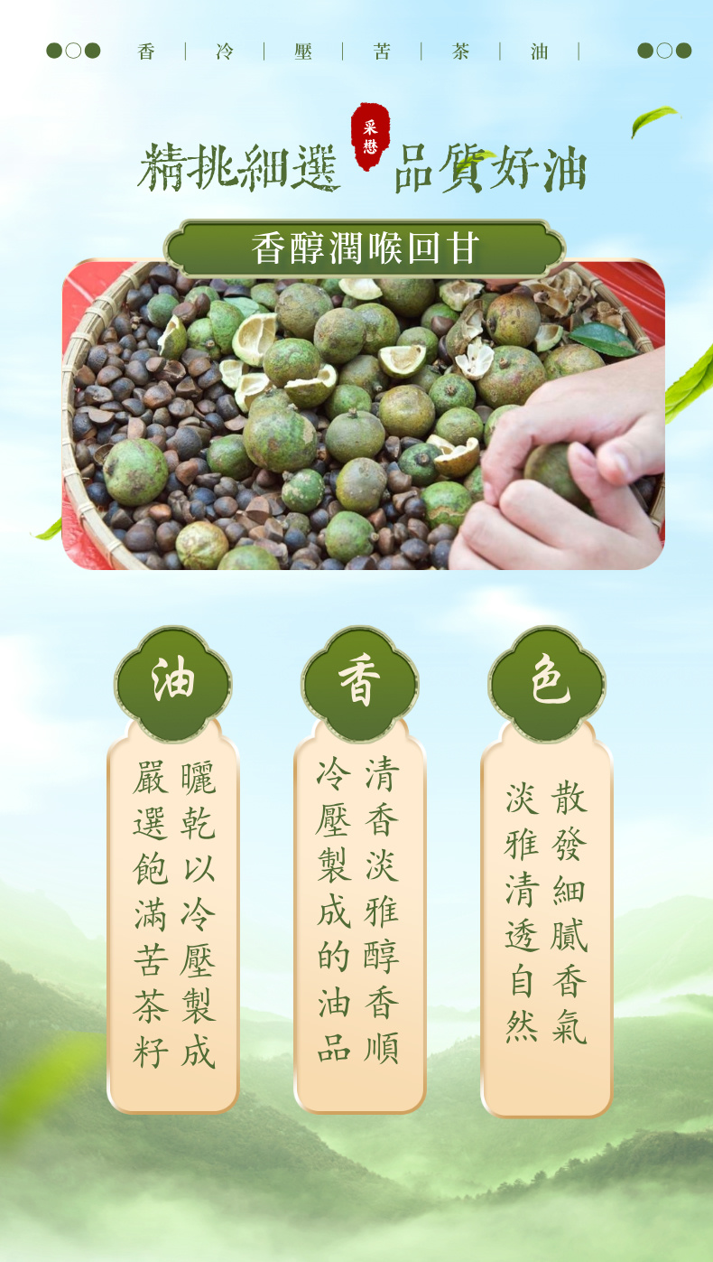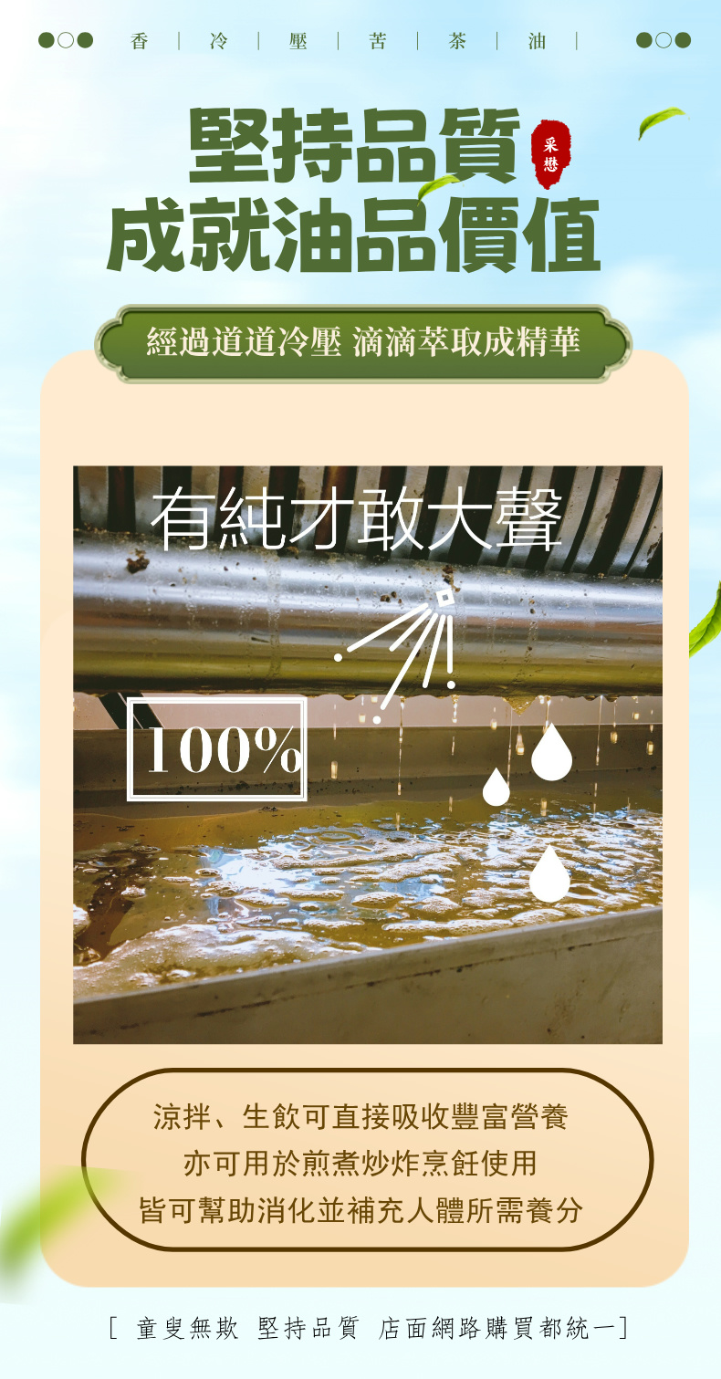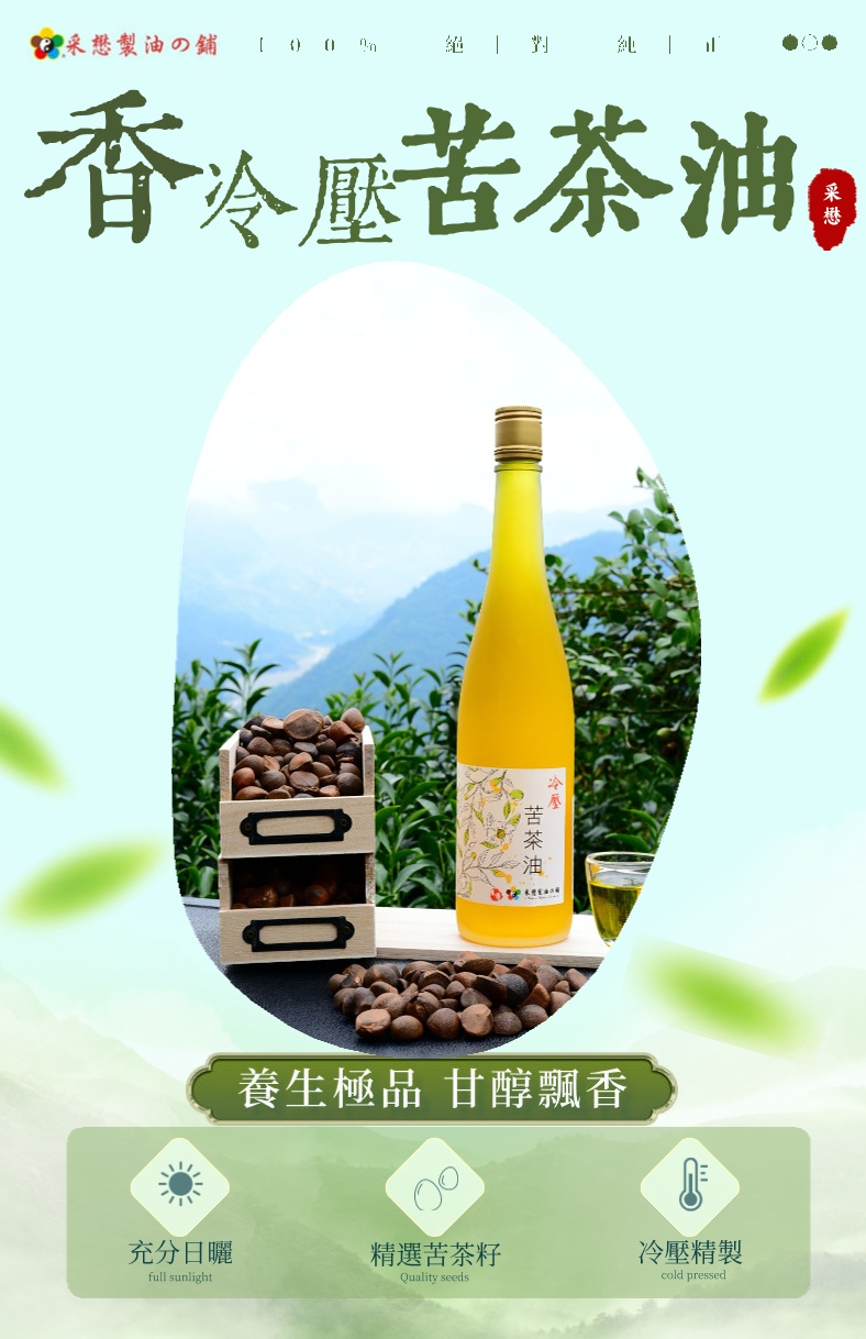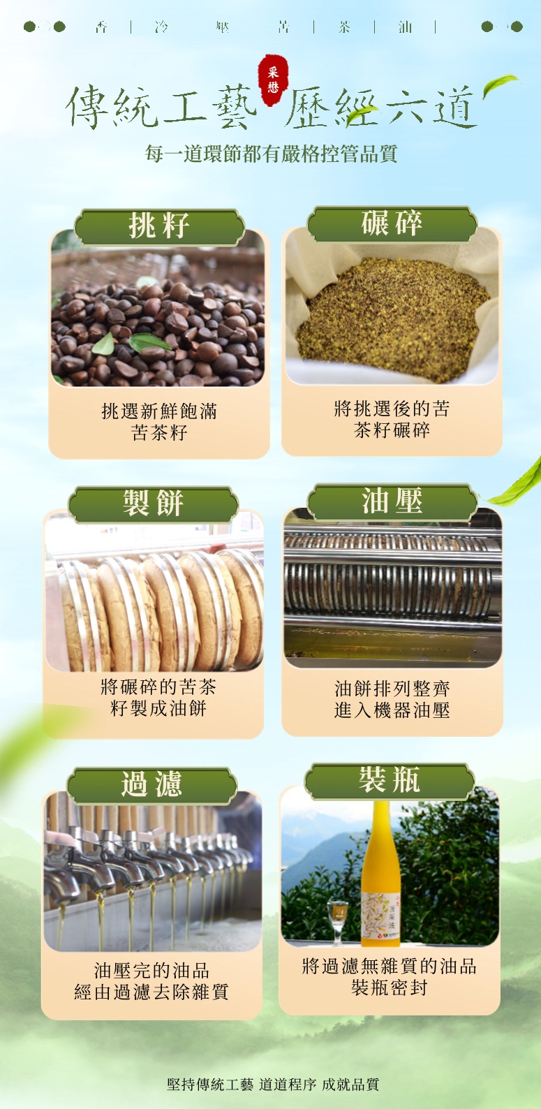傳承專業自北港百年榨油技術,結合傳統油車機械與現代化科技,嚴選優質野生苦茶籽、無農藥、無化肥的自然農作法,嚴守取得第一道冷壓初榨苦茶油,保留苦茶油特有的濃郁香氣,並且利用獨家工法去除苦澀味。